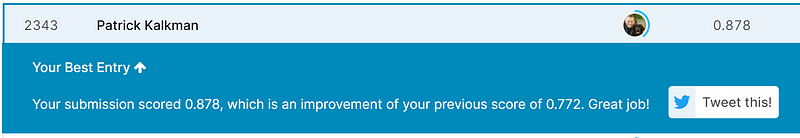 When we submit this model to Kaggle, it scores 0.772, which moves us up to the 2927 place on the public leaderboard. An excellent step upwards.