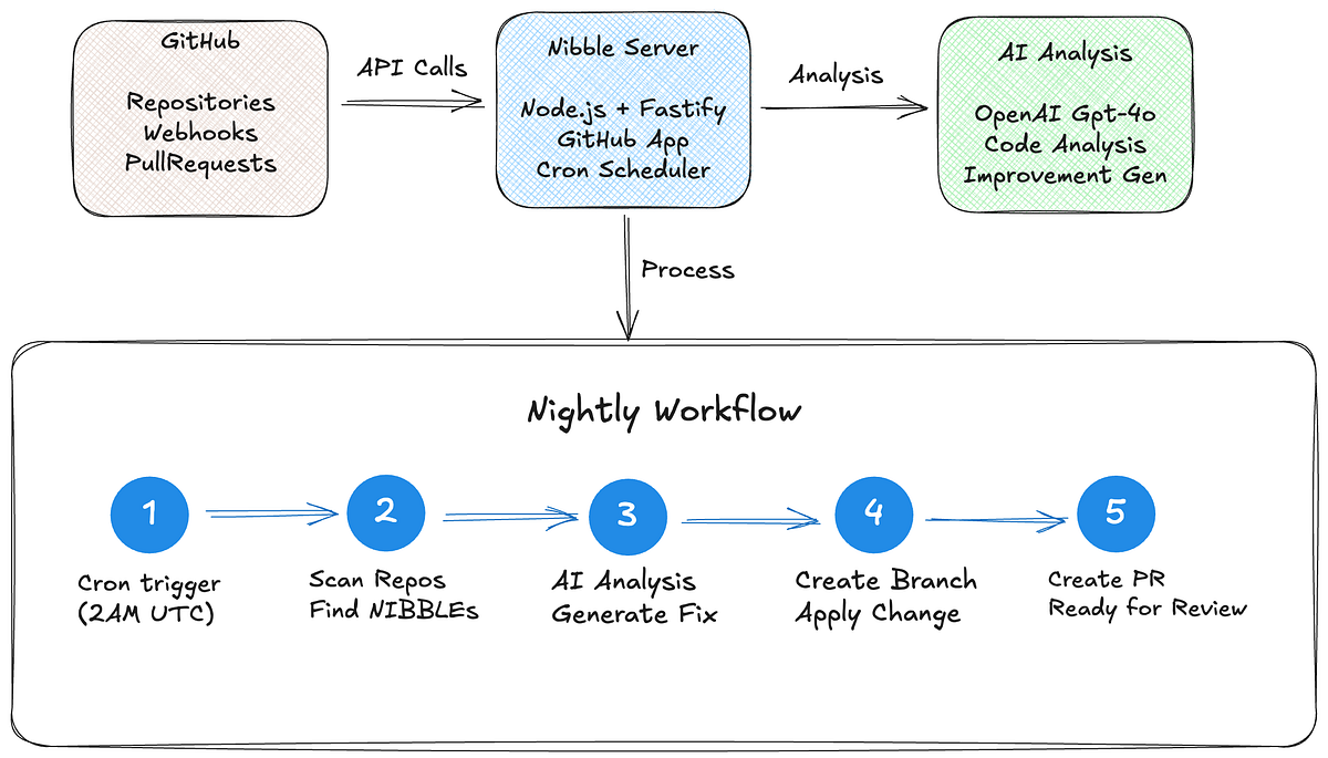 At its core, Nibble operates on a beautifully simple principle: find one thing to improve, improve it, and submit it for review. But simplicity in concept doesn’t mean simplicity in execution. Let’s peek under the hood.